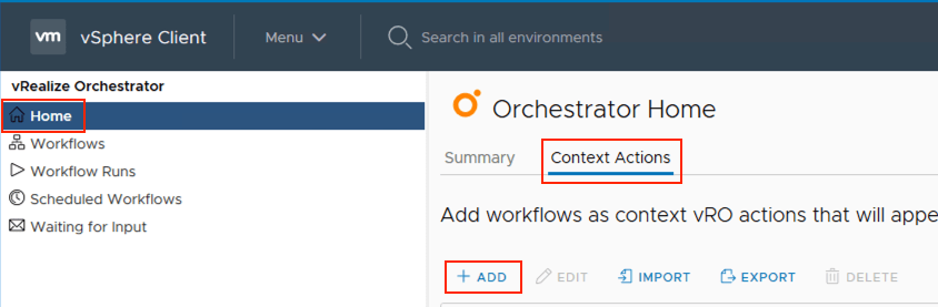 If you have successfully registered your vRealize Orchestrator (vRO) in the vCenter Web Client you can add your workflows as a context action. Follow Add vRO 8.x extension to vCenter Web Client for details on how to register the vRO in vCenter. What does context action mean. Well it means that your workflow becomes selectable from the vRO menu item in the vCenter Inventory. For example you add your workflow to a context action of a virtual machine. If you then right click on any virtual machine and then select vRealize Orchestrator -> Run Workflow… you can then select your workflow. In order for this to work you must define what inventory object should be linked with what workflow. If an input parameter of your vRO workflow is of type Virtual Machine you would want this to link to Virtual Machine objects in the web client. That way your workflow will get pre-filled with Virtual Machine from which you started the workflow from. Here are the steps for adding the context action.