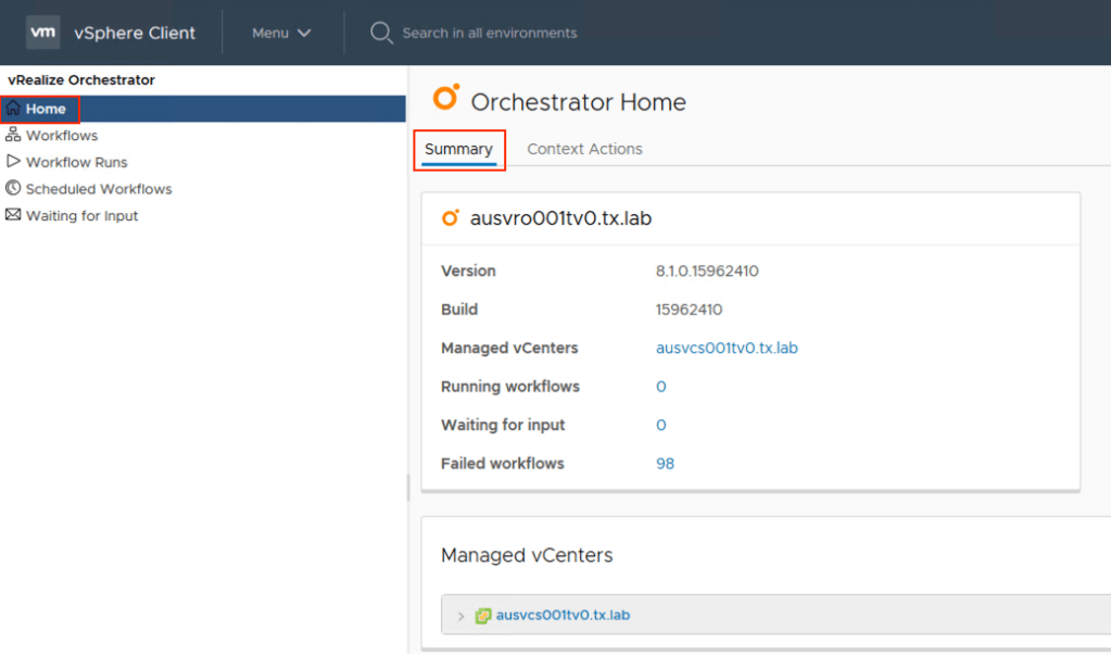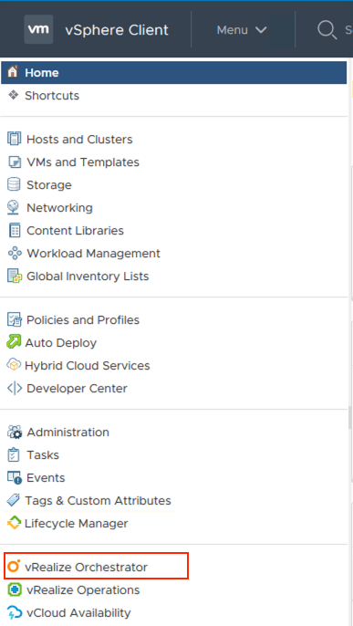 If the integration of vRO as extension was successful you should see a new menu item on the home screen. Click on the vRealize Orchestrator menu item.