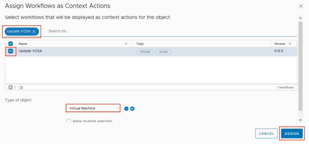 Now enter the name of your workflow in the search field and hit enter. The workflow should now show in the list below. Check the checkbox next to your workflow. Select the type of object you want to associate your workflow with. Meaning which vCenter inventory object should show your workflow. If you only have one vCenter inventory object, this field will be pre-filled. Click ASSIGN and you are done.